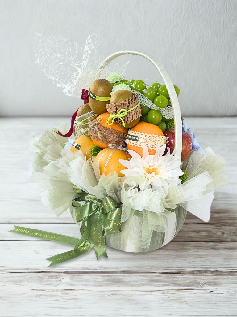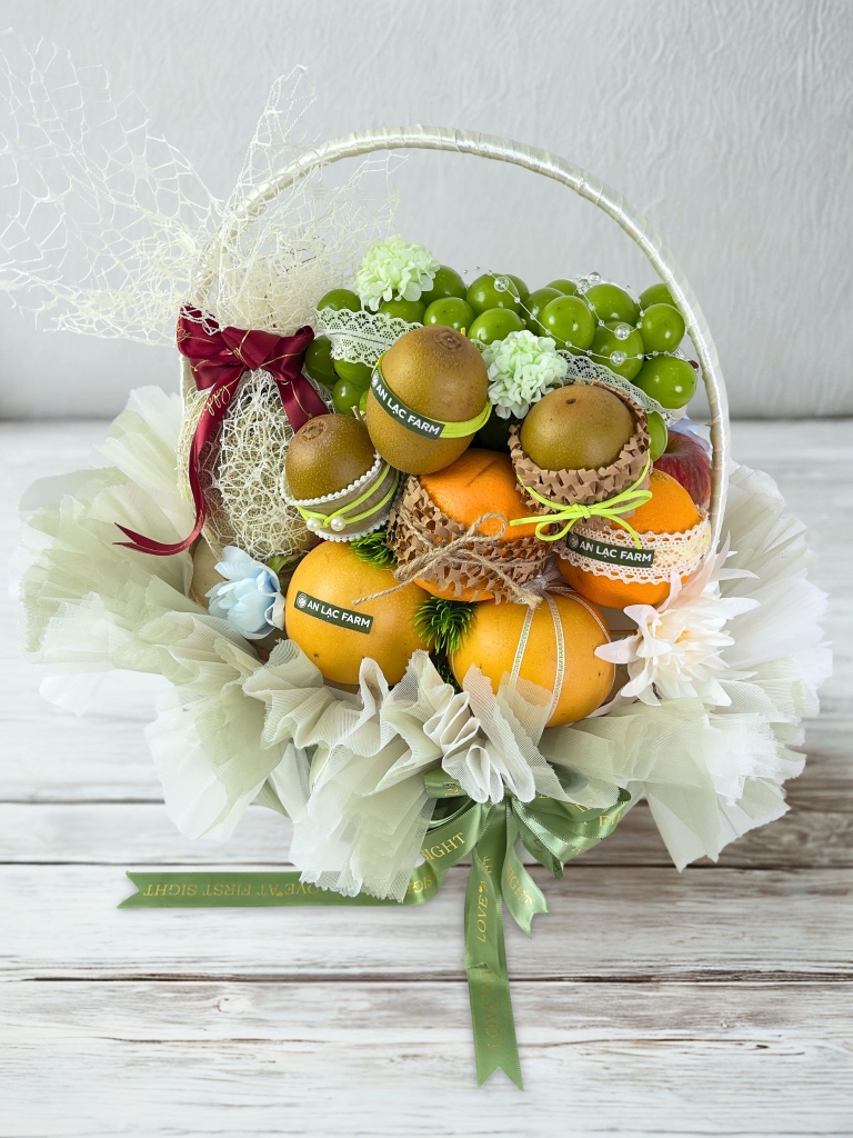 "Ánh Ngọc Ngọt Lành" từ An Lạc Farm là một kiệt tác nghệ thuật thiên nhiên, nơi bàn tay khéo léo của người thợ tỉ mỉ bọc từng lớp voan mềm mịn phối 2 màu xanh trắng cho chiếc giỏ mấy thêm trang hoàng.Lớp voan được tô điểm bằng dải ruy băng lụa xanh thẫm dập chữ vàng tinh xảo, thắt thành nơ mềm mại ở trung tâm, mang đến sự sang trọng và ý nghĩa sâu sắc về tình yêu thương lan tỏa.Những loại trái cây nhập khẩu cao cấp được sắp xếp hài hòa, phản ánh sự phong phú của đất trời và tình cảm chân thành. Từng chi tiết hòa quyện, biến chiếc giỏ thành một tác phẩm nghệ thuật sống động, phản ánh tinh thần ấm áp và tươi mới