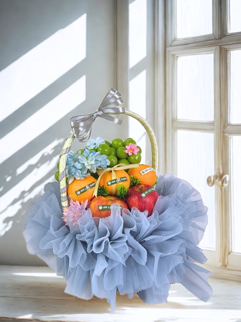 "Vũ Điệu Trái Cây"- từ An Lạc Farm là một tuyệt phẩm thanh lịch, tôn vinh vẻ đẹp tự nhiên với voan mềm bồng bềnh màu xanh xám ôm trọn giỏ mây, mang đến nét dịu dàng. Bên trong, Cam Úc vàng tươi mọng nước, Táo đỏ giòn tan rực rỡ, Nho xanh ngọt thanh mát lành, được điểm xuyết bởi hoa lụa tinh tế, tạo nên một khu vườn mini tràn đầy sức sống.. Đây là món quà lý tưởng để gửi gắm tình cảm trong các dịp đặc biệt.
