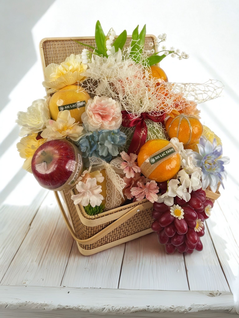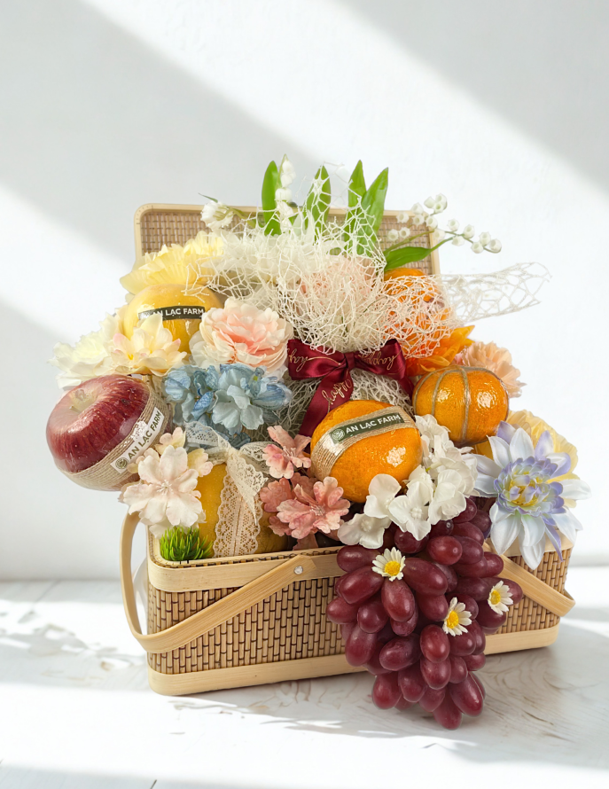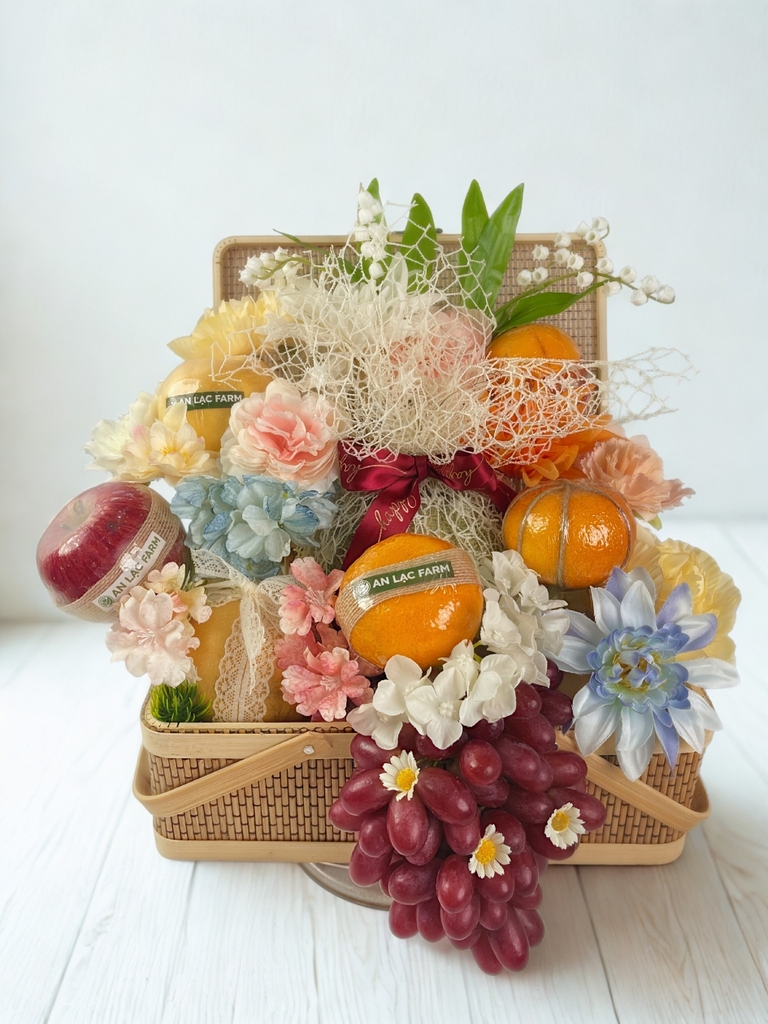 "Vườn Thượng Uyển" từ An Lạc Farm là một tác phẩm nghệ thuật lẩy cảm hứng từ thiên nhiên, được trình bày trong giỏ mây thủ công hình chữ nhật, mang vẻ đẹp mộc mạc nhưng đầy thanh lịch. Giỏ được đan từ tre tự nhiên với màu nâu nhạt ấm áp, viền mây uốn cong chắc chắn, tạo hình cân đối như một khu vườn thu nhỏ. Những bông hoa lụa đa sắc được cắm khéo léo quanh các góc và trung tâm, tạo điểm nhấn mềm mại, hòa quyện với trái cây như những bông hoa nở rộ trong khu vườn thượng uyển, tăng thêm vẻ đẹp thanh thoát.