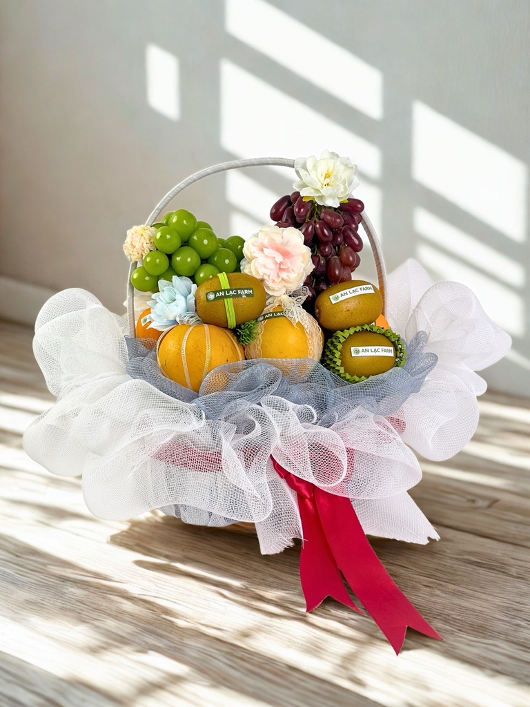 "Hương Sắc Quả Mọng"- Một kiệt tác thiên nhiên hòa quyện, Giỏ Quả Tinh Tế An Lạc khoác lên mình lớp lưới sóng xanh trăng thanh thoát, điểm xuyết ruy băng lụa đỏ rực rỡ. Bên trong là sự kết hợp hoàn hảo của nho xanh ngọt lành, nho đỏ mọng nước, lê sữa thơm ngát, kiwi tươi mát, được tô điểm bởi hoa lụa dịu dàng, mang đến món quà sang trọng và tràn đầy ý nghĩa.