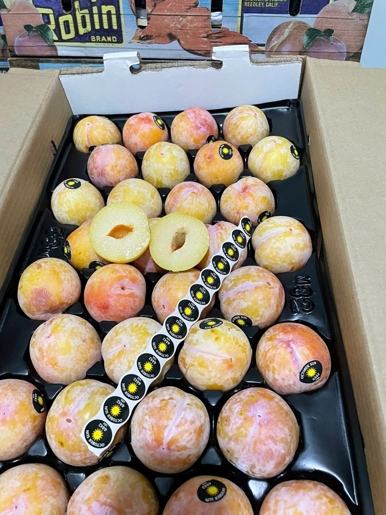 ☀️ Mận Mỹ October Sun đến từ vùng đất đầy nắng và gió California, Hoa Kỳ. Vỏ mận màu hồng cam còn vương chút phấn trắng tự nhiên. Thịt mận vàng óng, giàu Vitamin C tốt cho sức khỏe.
